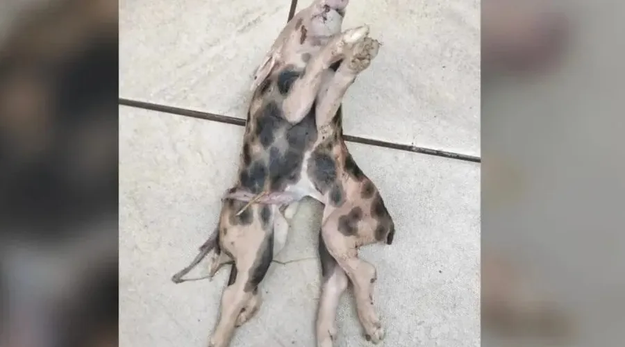 O animal fazia parte de uma ninhada de sete filhotes, mas nasceu já sem vida. A cena despertou curiosidade entre familiares e vizinhos, que nunca haviam presenciado algo semelhante.